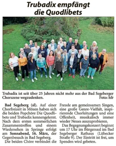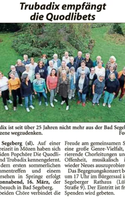 Im Januar 1996 starteten die Proben des Chores Trubadix. Jeden Donnerstag treffen sich viele SängerInnen von 20.00 bis 21.30 Uhr